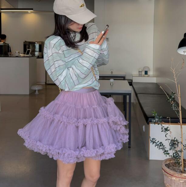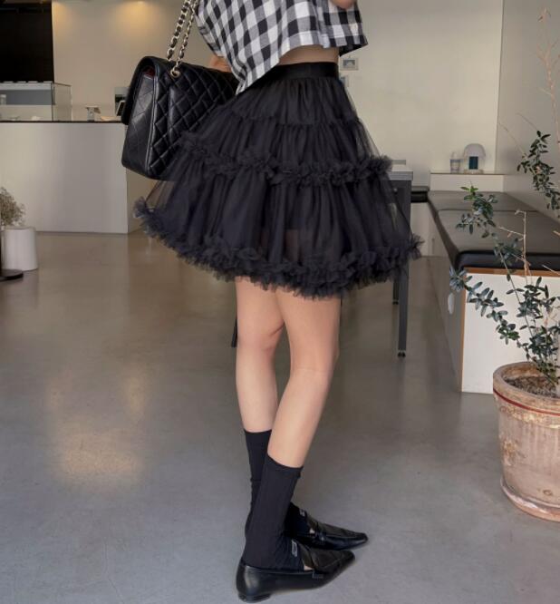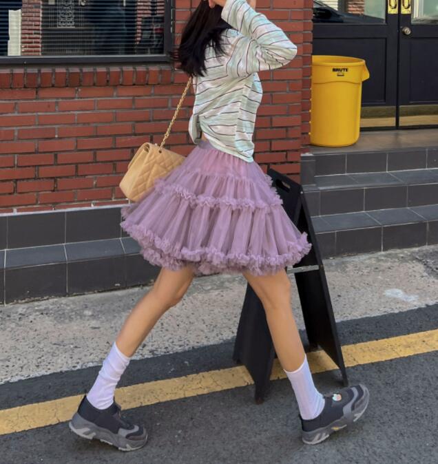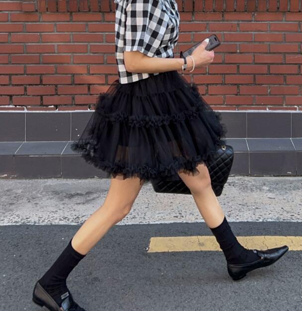 重ねられたチュール生地が美しいボリューム感を演出し、歩くたびに揺れる軽やかなシルエットが魅力的。