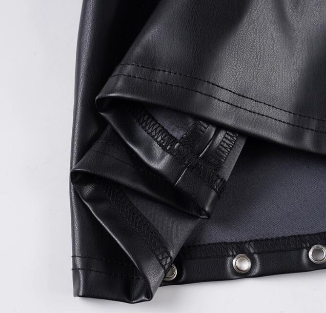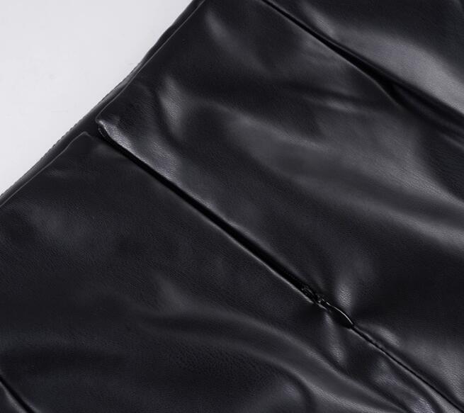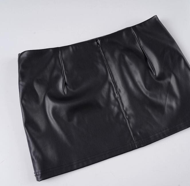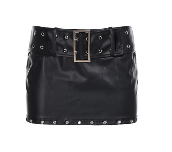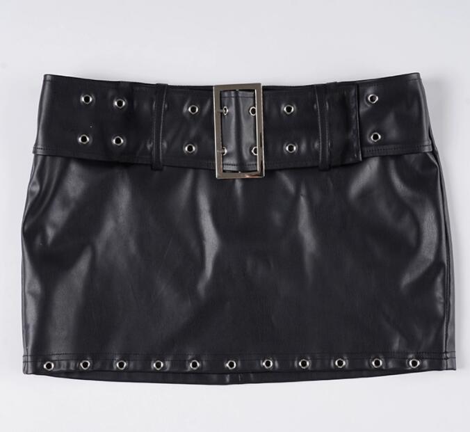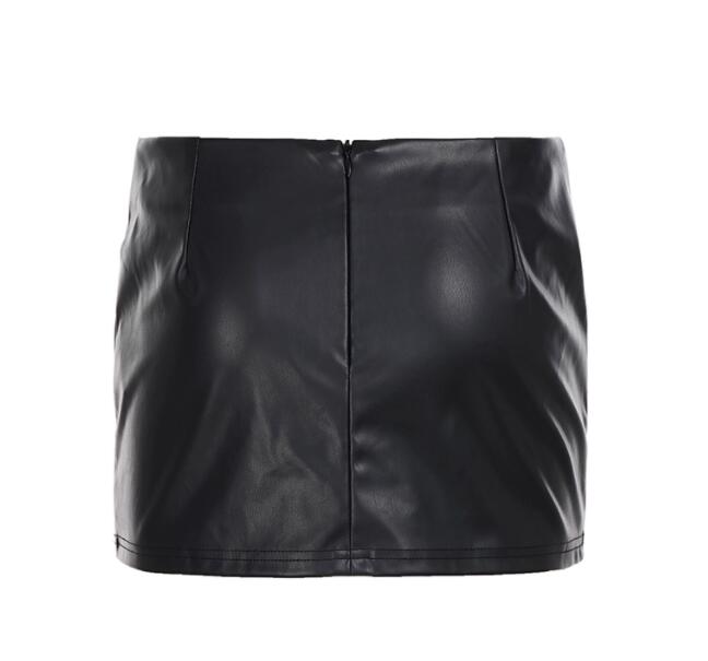 エッジの効いたパンク風デザインが魅力的な黒革調タイトミニスカート。